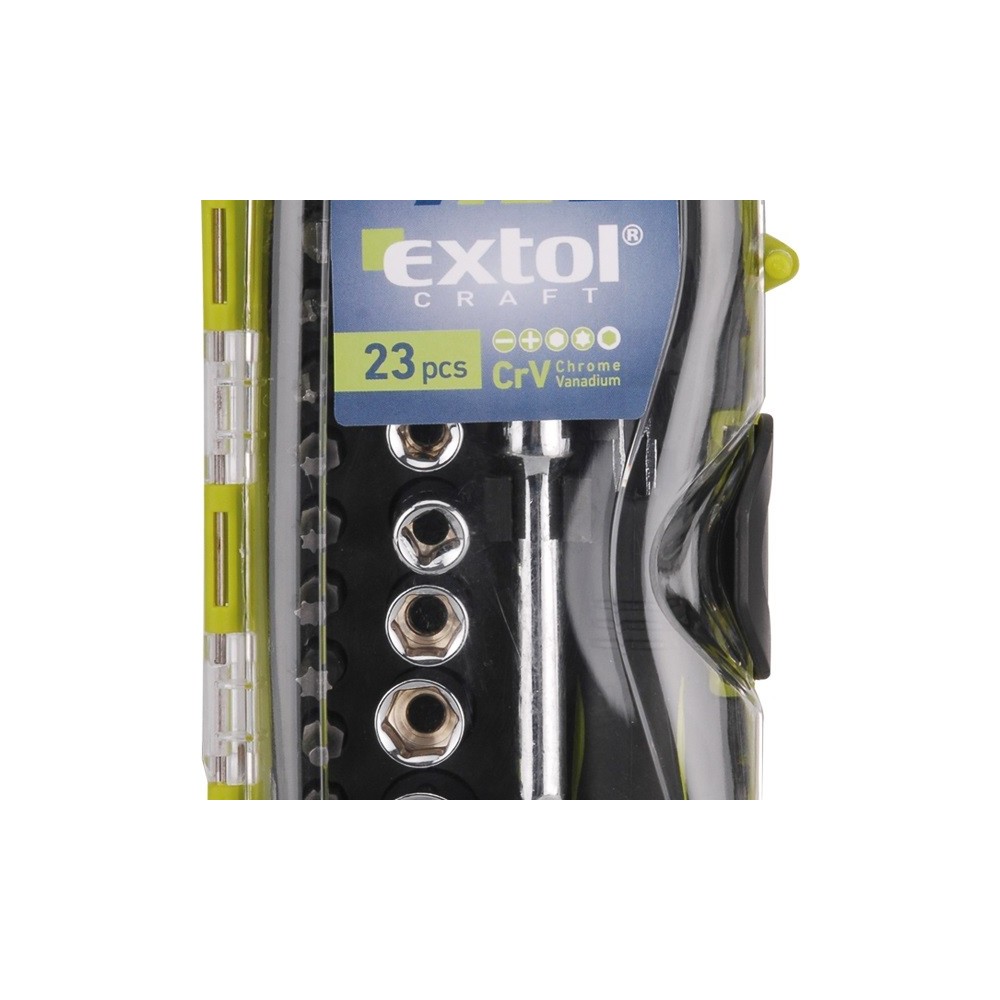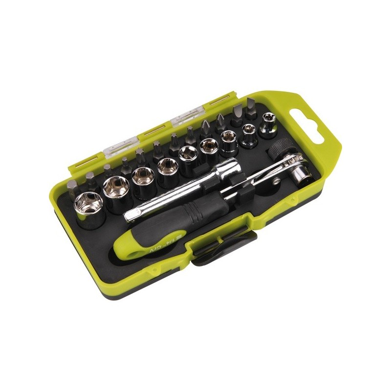 23db-os, Crv, 1/4"dugókulcsok:4-13mm, BIT-ek: lapos,PH,Imbusz,Torx, irányváltós, mágneses racsnis hajtókar, műanyag dobozban
