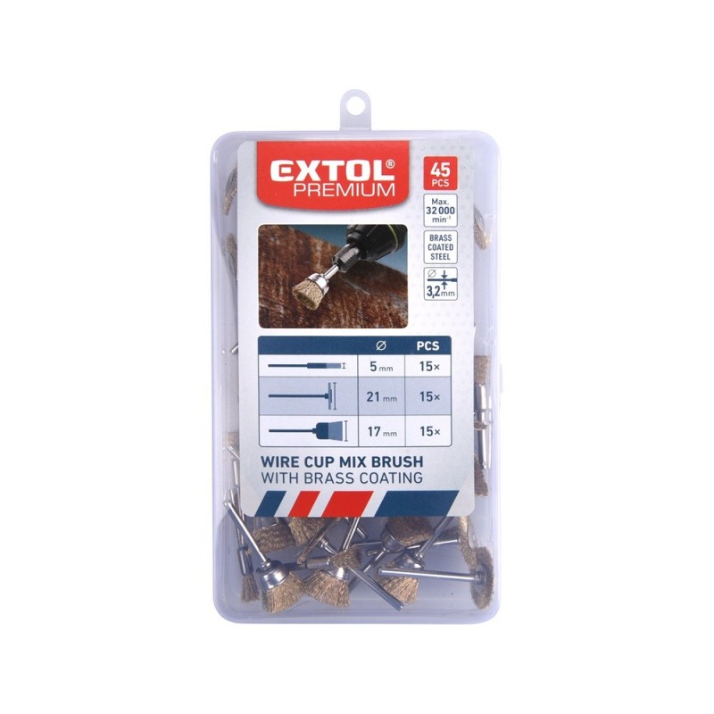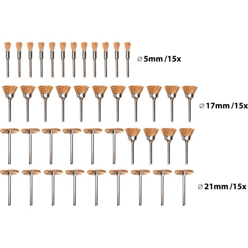 mini drótcsiszoló klt. 3,2 mm befogás, 45 db, 3 féle fazékkefe fejforma, rezezett acélszál